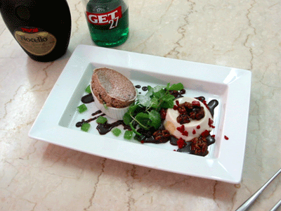 第9回・・・(デザートの一皿、暖かいスフレ)胡桃のブランマンジェ、ソースオーショコラ赤いフルーツの飾り。スフレショーショコラミントジュレーの飾り