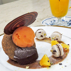 パリの銘店「ダロワイヨ」の銘菓オペラ。 エスプレッソのクレームにオレンジの香り、ショコラのコーティングのアントルメ。 オペラをムースやクレーム、アイスクリームで一皿のデセールに昇華させましょう! リキュールはウオッカにオレンジジュースにガリアーノという薬草酒を合わせた「ハーベイ・ウォールバンガー」をシェフアレンジでよりスパイシーなホットカクテルに仕立てて合わせます。 |