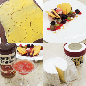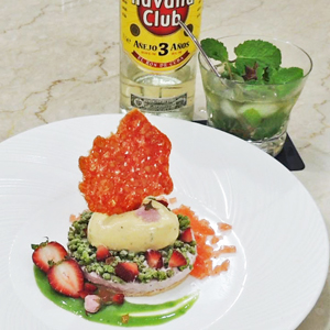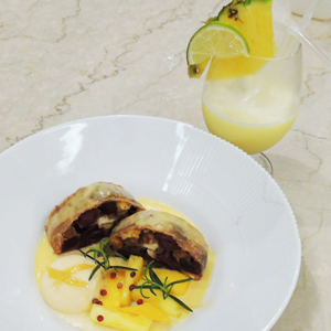 オーストリアの定番デザートのシュツリューデルを夏向きアレンジ。フロマージュブランとドライフルーツグリオットチェリーのチーズケーキのようなクレームを薄いスパイスパータシュツリューデルに巻いて焼き上げ、トロピカルフレッシュフルーツと生姜とヴァニラのアイスクリームとオレンジアングレーズを添えていただいます。 合わせるカクテルは、パインとココナッツラム酒が織りなす味わい、ピニャコラータ。 |