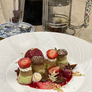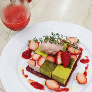 苺と赤ワインのティラミスに、抹茶のシュトロイゼル、桜ヴァニラアイスクリームと桜とハーブのジュレに桜のチュイールにベリーたちを添えた、桜とベリーのアシエットデセールに、ミントだけでなく多彩なハーブを配合した、シェフオリジナルもヒートを添えましょう。 | 苺のクレームと桜のフリアンディーズのモザイク柄のデセールに、イチゴのアイスクリームを添えて賑やかな一皿に仕上げます。 苺と相性の良いタイムとイチゴとラム酒のフローズンダイキリをお供に添えましょう。 |