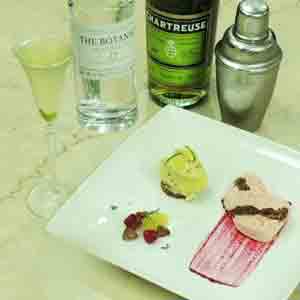 ラベンダーのティラミスに、ハーブのジュレやキウイのソルベを合わせたアシエットデセールに シャルトリューズ修道院の薬草酒とジンを合わせたショートカクテル、シェフが愛したスパイシーな「アラスカ」を添えましょう。 |