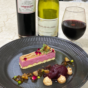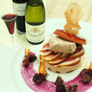 イチジクのムースにマロンを合わせて、イチジクの赤ワイン漬けのアイスクリームにフィナンシェのカラメリゼ。赤ワインのソースを添え他一皿に併せるリキュールは、ブルゴーニュの白ワイン「アリゴテ」とブルゴーニュのカシスリキュールを合わせた、キール。 | 栗と相性が良いカシスを合わせた、ムースバトンにマロンペーストとクラックラン、カシスのソルベとカラメルエスプレッソのジュレを添えたアシエット。 併せるカクテルは、ブルゴーニュのボジョレー地区の酸味と甘みのバランスの取れた「ガメイ種」の赤ワインとブルゴーニュのカシスリキュールを合わせた、カルディナーレ。 |