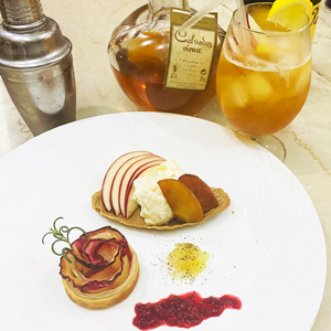 ノルマンディシードルと林檎を合わせた一皿をお作りします。 そば粉のクレームガレットのタンバルにシードルのムースとりんごのカラメリゼ、可愛いバラの花のアップルパイを添えて、黒胡椒のりんごエチュべと木苺のソースでいただきましょう。 カップリングカクテルは、シードルでお作りしたカルバドスサワー。 |